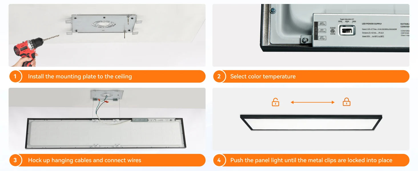 ComiLED’s 1x4 led flat panel light surface mount offers adjustable 3000K, 4000K, and 5000K colors with Triac dimming (5-100%). Delivering 4400LM at just 40W, it’s efficient and easy to install solo. ETL certified and backed by a 5-year warranty for long-lasting quality.